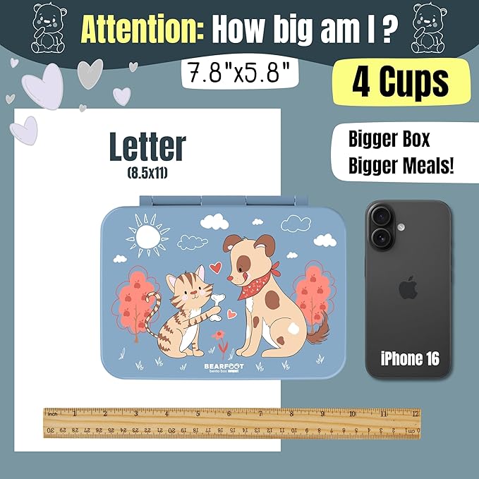 BEARFOOT Kids Lunch Box with Compartments โ Compact & Lightweight | Leak-Proof, BPA-Free, Dishwasher & Microwave Safe | Hand-Drawn Design for Preschool, School, Travel (Dog & Cat Blue, 4 Cups)