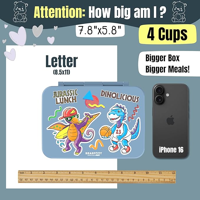 BEARFOOT Kids Lunch Box with Compartments โ Compact & Lightweight | Leak-Proof, BPA-Free, Dishwasher & Microwave Safe | Hand-Drawn Design for Preschool, School, Travel (Dinos Blue, 4 Cups)