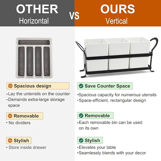 - HEAVY-DUTY & EASY-CLEAN MELAMINE:Crafted from high-quality, shatter-proof melamine, this utensil caddy is built to last. The smooth, non-porous surface resists stains and makes cleaning effortless, and the bins are dishwasher-safe for your convenience