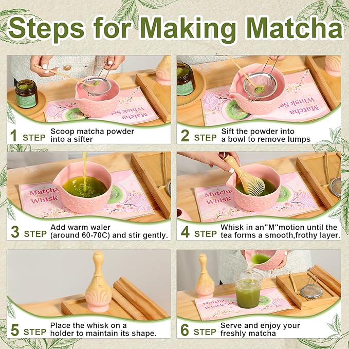 - 【Complete Matcha Set】:This all-in-one matcha set includes everything you need for an authentic matcha experience: 1 Resin Matcha Whisk, 1 Bamboo Scoop, 1 Stainless Steel Strainer, 1 ceramic matcha bowl, 1 Matcha Whisk Holder, 1 Cherry Blossom Tea Towel, and 1 Gift Card. Each tool is meticulously crafted, and the included card makes it easy to add a personal message, perfect for gift-giving.