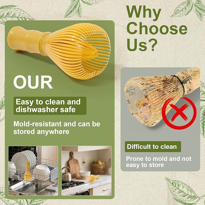 - 【MEasy Care & Storage】:The matcha whisk is made from resin. Unlike typical bamboo whisks, it's designed to be more durable, and will not come apart, offering flexible storage options. It is also dishwasher safe. The bamboo scoop is crafted for consistent measuring. Simply rinse with cool water, pat dry and store in a cool, dry place.
