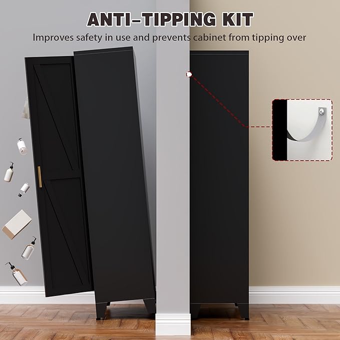 61" Tall Metal Pantry Cabinet, Kitchen Storage Cabinet with 2 Doors and 3 Adjustable Shelves for Kitchen, Living Room, Dining Room, Bathroom and Home, Office (Black, 61" H)