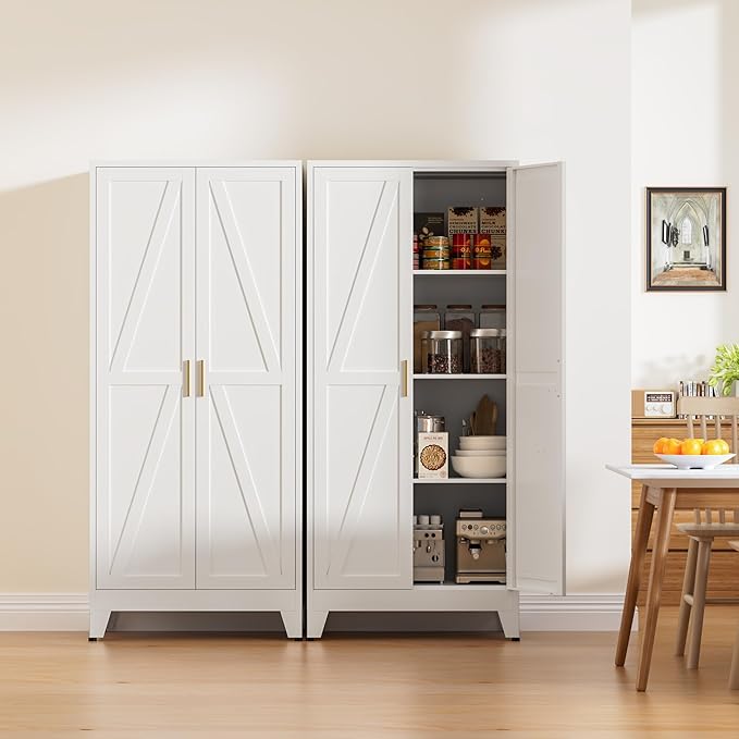 61" Tall Metal Pantry Cabinet, Kitchen Storage Cabinet with 2 Doors and 3 Adjustable Shelves for Kitchen, Living Room, Dining Room, Bathroom and Home, Office (White, 61" H)