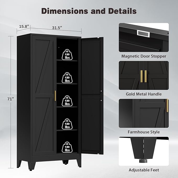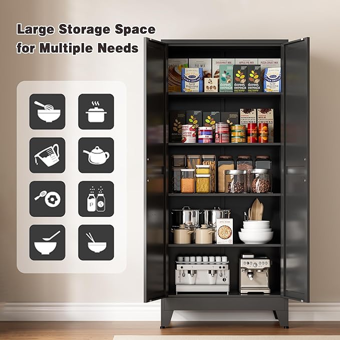 71" Tall Metal Pantry Cabinet, Kitchen Storage Cabinet with 2 Doors and 4 Adjustable Shelves for Kitchen, Living Room, Dining Room, Bathroom and Home, Office (Black, 71" H)