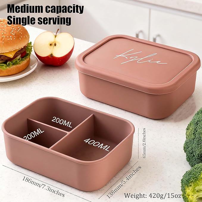 Custom Silicone Bento Box | Personalized Lunch Box with Engraved Name/Logo | Lunch Containers for Work Travel Outdoor with 3 Compartment