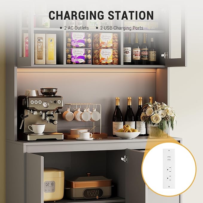 - Versatile Charging Hub & Microwave Stand:Keep your countertops clutter-free with our kitchen pantry storage cabinet with microwave stand, featuring a built-in charging station (2 AC outlets + 2 USB ports). Whether you're powering small appliances like coffee makers or charging devices while cooking, everything stays organized and within reach. The sturdy top shelf is ideal for microwaves, while the compact footprint makes it a perfect small kitchen pantry storage cabinet for apartments.